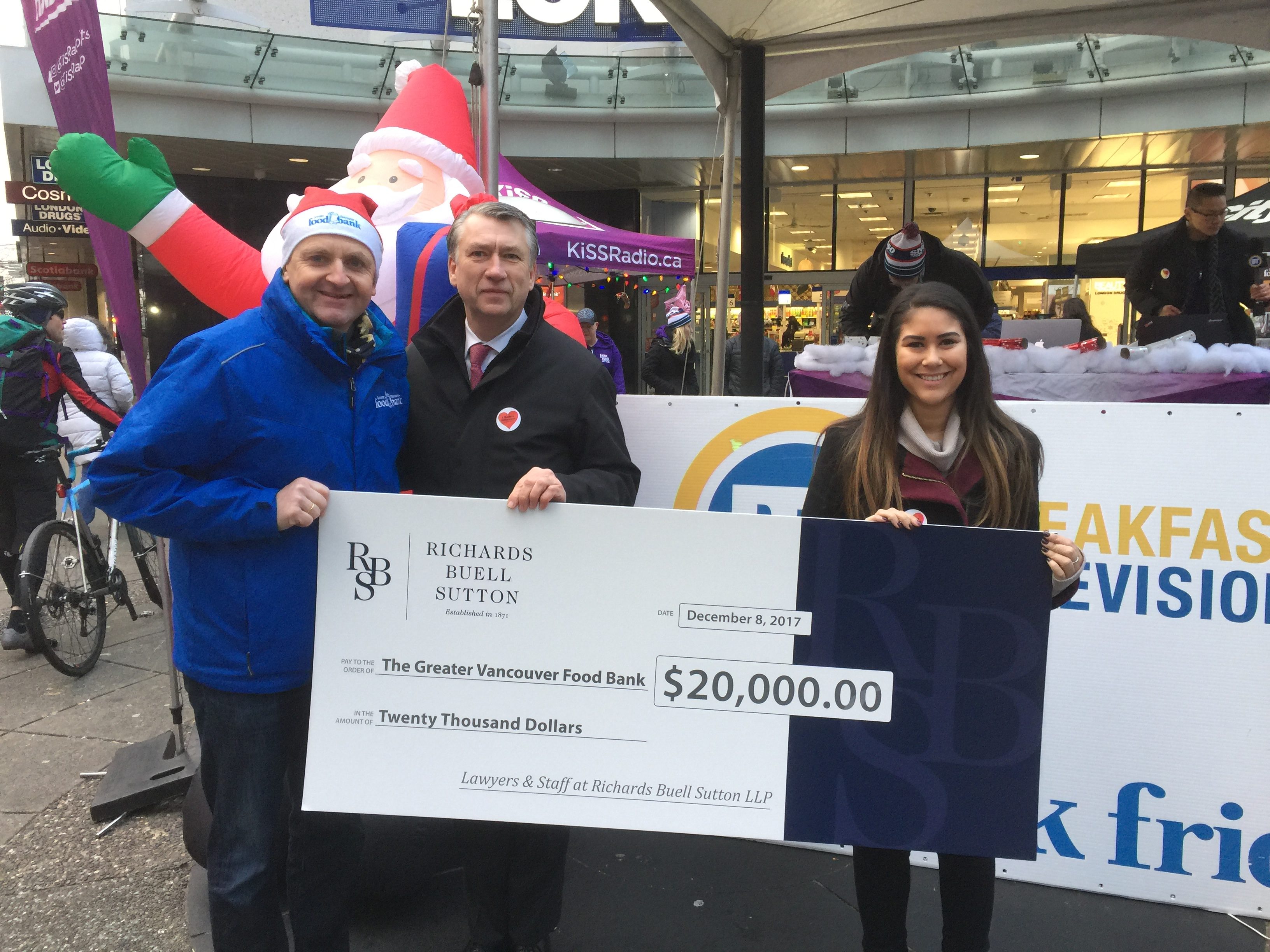 In the spirit of the season, for the 10th consecutive year we are pleased to continue our support of the Greater Vancouver Food Bank (GVFB). On behalf of the lawyers and staff at RBS, Managing Partner, Jeff Lowe, Q.C. and Lindsey Antic, RBS’ Food Bank Volunteer Coordinator, presented a donation of $20,000 to the GVFB on Breakfast Television and KiSS RADiO this morning. Each week, the GVFB provides access to healthy food and services to over 26,500 people. For every $1 donated, this organization is able to purchase $3 worth of food. Watch the interview on Breakfast Television here. To make a donation to the GVFB, click here.