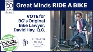 Vote for David Hay K.C. for The Georgia Straight’s Best of Vancouver Reader’s choice awards in the best “Bike Lawyer” category. The awards nomination process ends at noon on September 16th. Click here to test your knowledge of what Vancouver has to offer and place your votes: https://bit.ly/3jOizra.